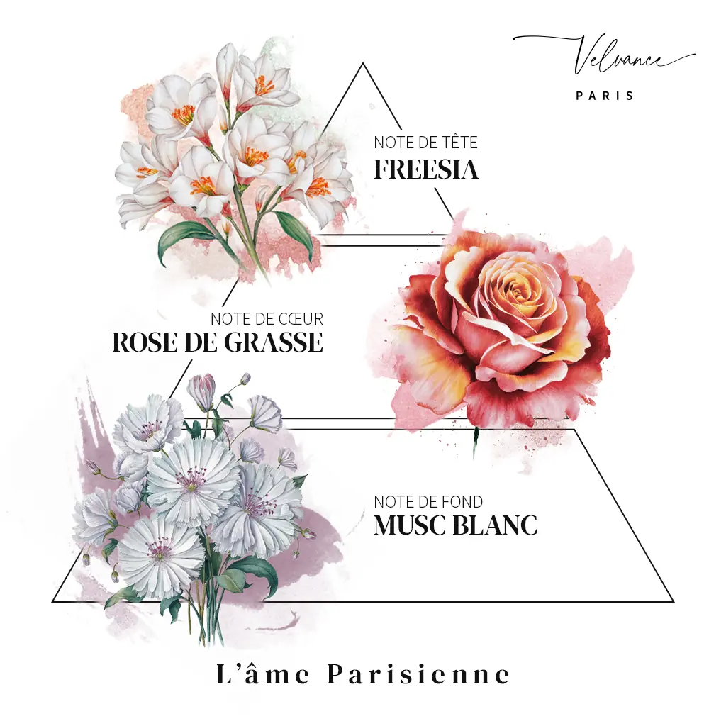 Enfin, L’Âme Parisienne s’épanouit dans une base sensuelle de vanille et de musc blanc, sublimée par des touches d’héliotrope et de freesia. Cette signature olfactive douce et persistante laisse un sillage inoubliable, rappelant les soirées parisiennes illuminées par la magie de la Ville Lumière.